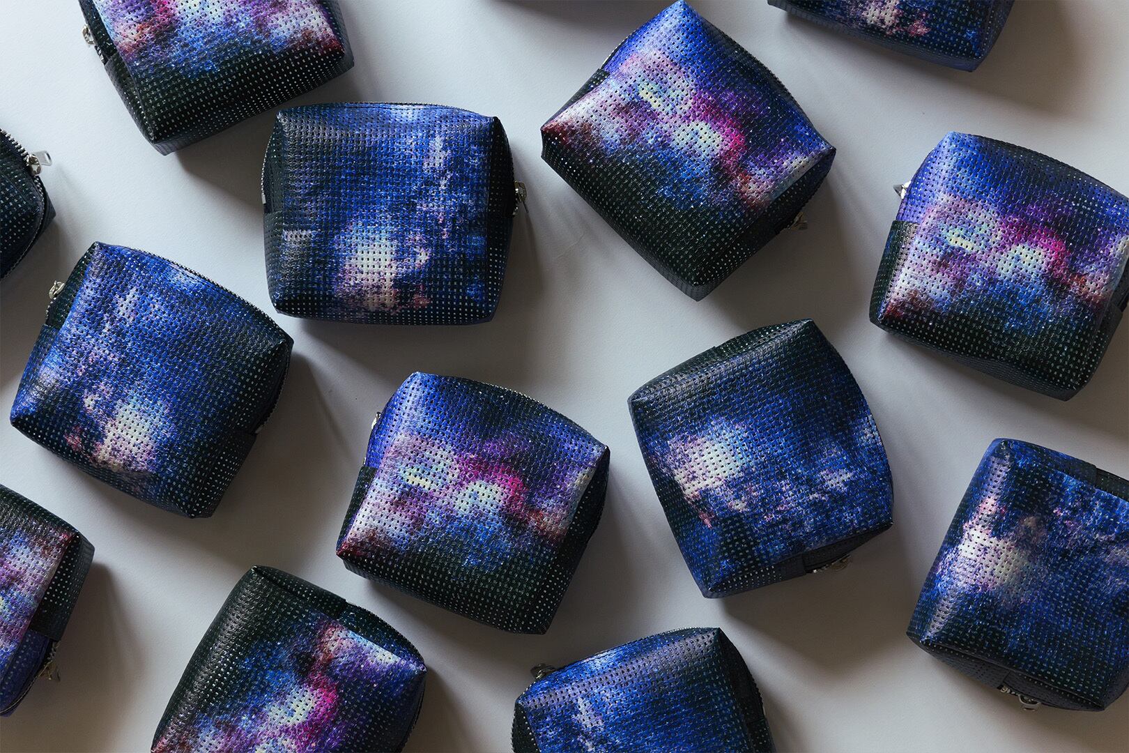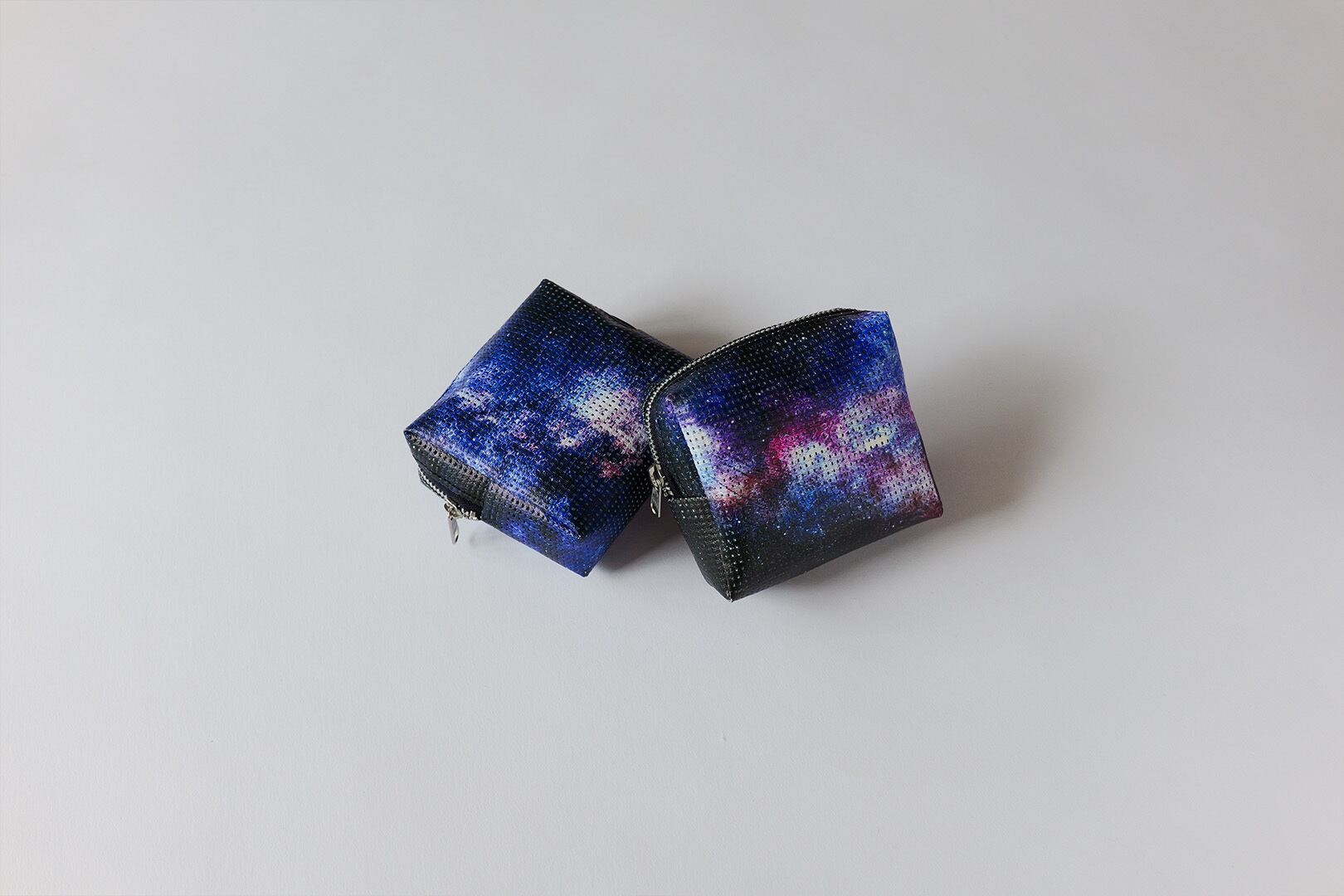 4種類の景色を描いたボックスポーチです。 デザインは下記4種類ありますのでお選びください 左上:星空を描いた景色 右上:銀河を描いた景色 左下:夜空と雲を描いた景色 右下:空と雲を描いた景色 こちらのポーチは、屋外広告に使用される メッシュターポリンという素材にプリントして 制作したボックス型のポーチになります。 メッシュのため、通気性があります。 お化粧ポーチなどにお使い頂けます。 サイズは横95mm×高さ90mm×奥行き40mmになります