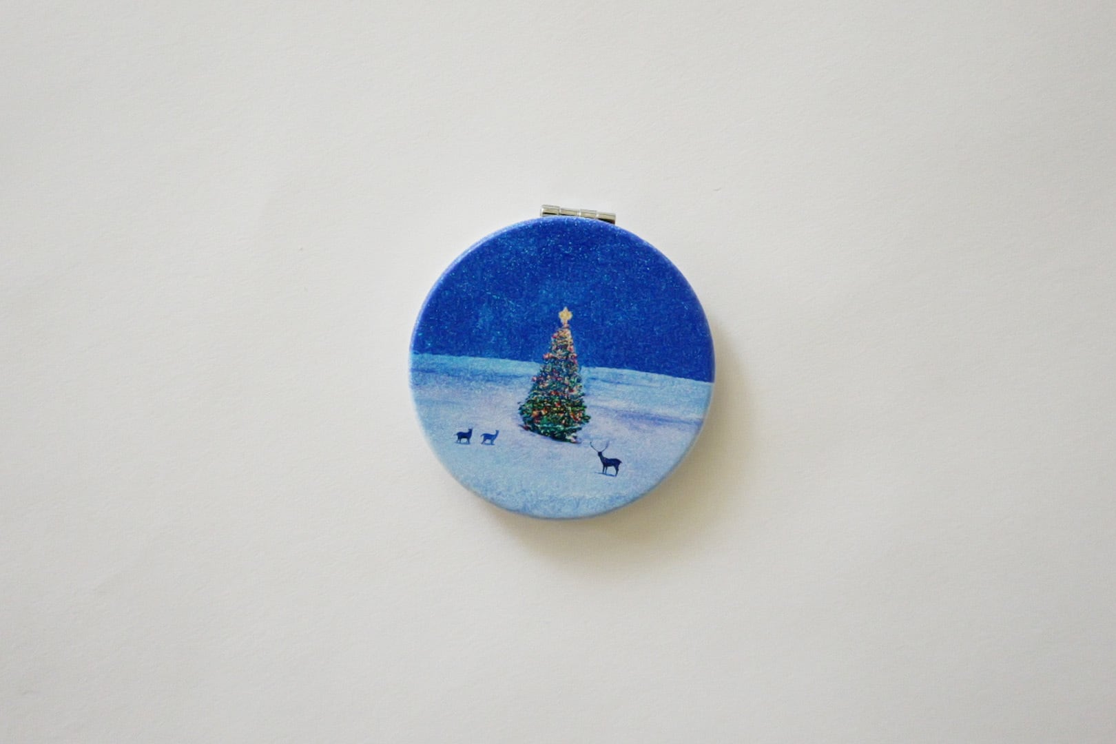 クリスマスツリーのある景色を描いた、 コンパクトミラーです。 通常鏡と拡大鏡の両面鏡となっており、 手の平サイズでコンパクトで軽く使いやすく 外出の際もハンドバックに入れても かさばらないサイズ感となっております。 外装は高級感があり汚れにくい PUレザーとなっています。 おもて面のみのプリントで 裏面は素材のまま(白)となります。 こちらは受注制作となりますので、 発送まで10日〜14日ほどお時間をいただきます。