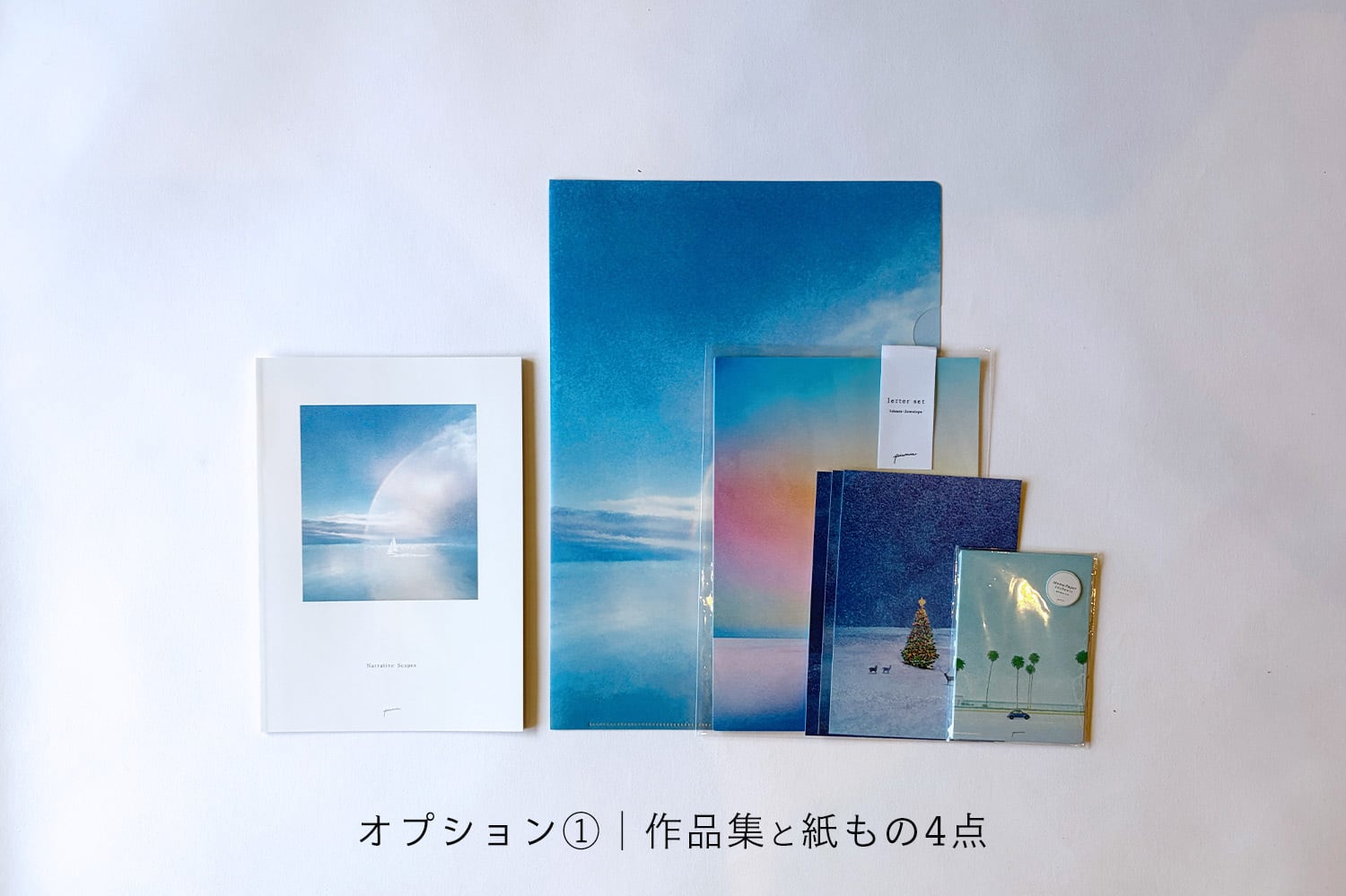 作品集、クリアファイル、レターセット、ポストカード 3枚、メモシート(30枚入り)