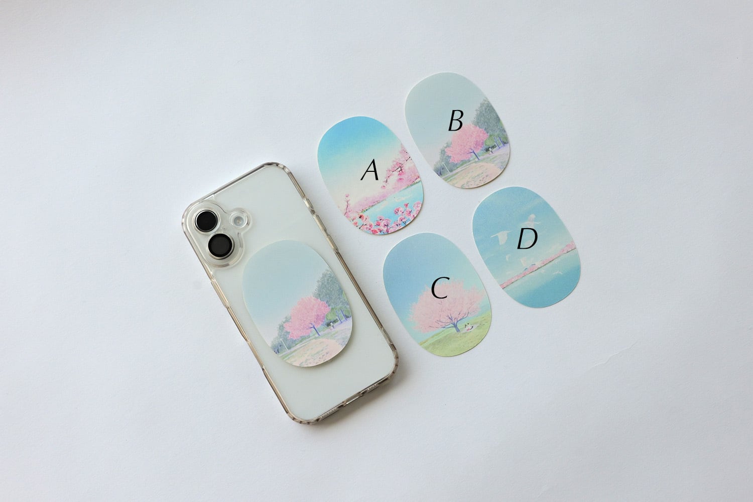飛行機の窓の形でくり抜いた 桜の景色を描いた、4種類のステッカー 2枚目の写真をご確認いただき、 ご希望のデザインをお選びください。 サイズは55mm×80mmで 上質紙にプリントしたものになります。 (防水機能はございません) 透明なスマホケースに挟んだり、 お好きなところに貼って 桜の景色を持ち歩いていつでも 眺めてもらえたら幸いです。