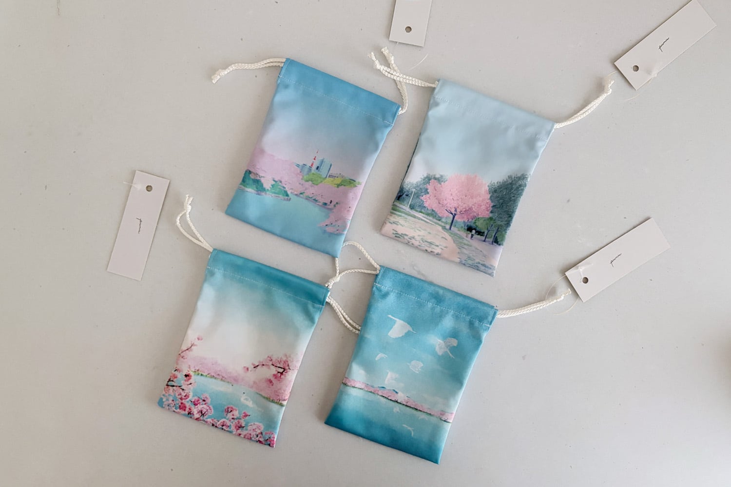 春の景色を描いた、小ぶりの巾着ポーチです。 デザインは4種類ありますので 1枚目の写真を見て、お選びください。 右上:春を散歩する景色 右下:桜と飛ぶ鳥 左上:桜と東京タワー 左下:桜とスワンボート 小ぶりなポーチなので リップクリームや充電器など、 カバンの中で行方不明になってしまうものを 入れるのに便利です。 サイズは105mm×145mmになります。